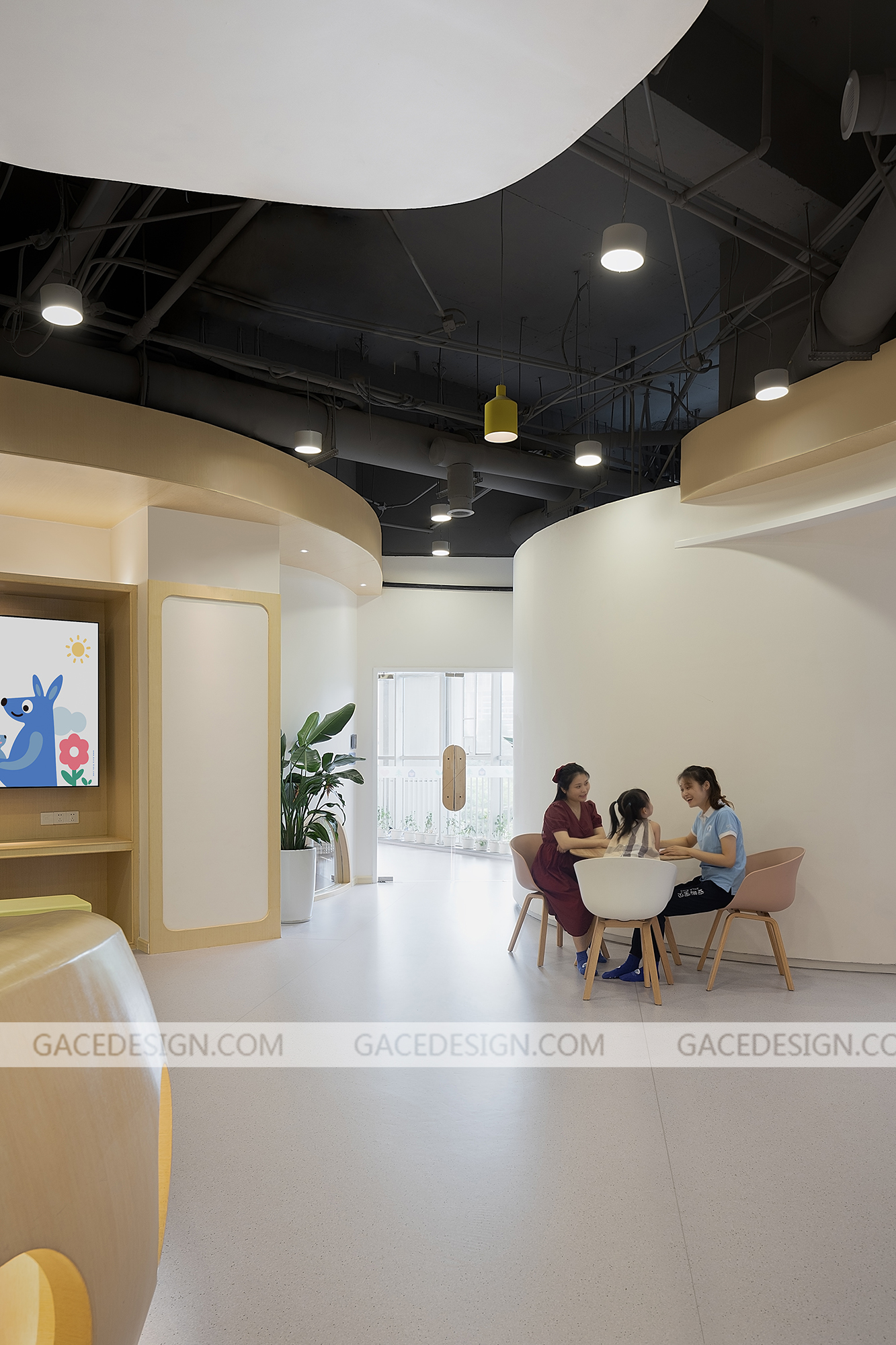 安啦寶貝是一家專注于培養兒童安全感的教育機構,提供父母課堂培訓及兒童綜合評測服務,其創業者擁有13年豐富的行業經驗,多年來不斷在兒童發展心理學、NLP、薩提亞、家庭系統排列、靈性成長及傳統文化等領域中學習,探索,成長。安啦寶貝兒童安全感早教利用一個豐富多變的曲線將異形、多柱且零散的空間整合起來。這條曲線猶如一條彩帶,激活了整個空間,使其既完整,又多變,趣味盎然且動感十足。