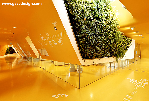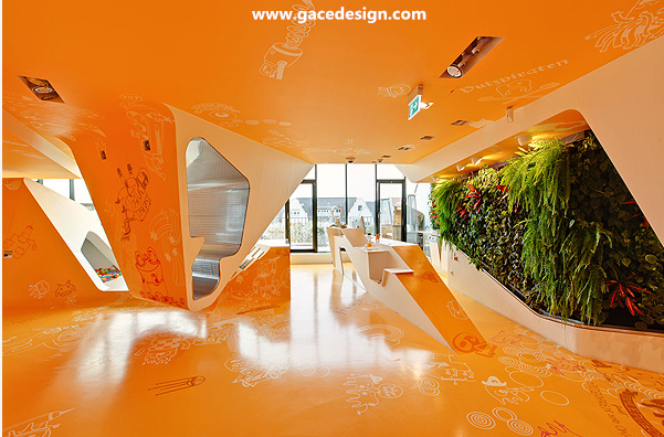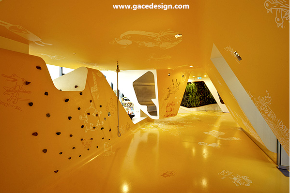 KU65兒童俱樂部位于德國。該項目打破了傳統空間概念,創作出了非常豐富而有趣的室內空間。建筑內部的地板,墻面和天花板甚至包括家具完全融為一體,仿佛一個有機體的內部。豐富的造型激發著來這里的孩子們的想象力與好奇心,天花板上懸吊下來的空間造型是可參與的,可爬可坐,或者做游戲,總之到處充滿了獨特的空間體會,讓他們很容易便忘記了即將到來的牙科醫生。