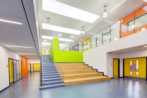 客戶希望擁有一所環(huán)境可持續(xù)發(fā)展的學(xué)校,并可以獲得相關(guān)的生命周期效益,這些要求被納入了設(shè)計(jì)開發(fā)中。建筑幾乎完全自然通風(fēng),面對一條繁忙道路的立面能夠降低噪音。中央北向窗戶與建筑管理系統(tǒng)相連,建筑管理系統(tǒng)會(huì)對建筑內(nèi)的溫度和二氧化碳含量做出反應(yīng)。所有的教室和學(xué)校大廳都有通風(fēng)煙囪,可以通過立面的洞口和格柵進(jìn)行被動(dòng)通風(fēng)。建筑過熱的潛在問題通過仔細(xì)設(shè)計(jì)懸挑結(jié)構(gòu)和建筑朝向得到了解決,無需使用機(jī)械通風(fēng)和制冷設(shè)施。環(huán)境性能取決于細(xì)考慮的建筑方案,并通過能對日光、熱和二氧化碳含量做出反應(yīng)的“智能”機(jī)電系統(tǒng)得到提高。