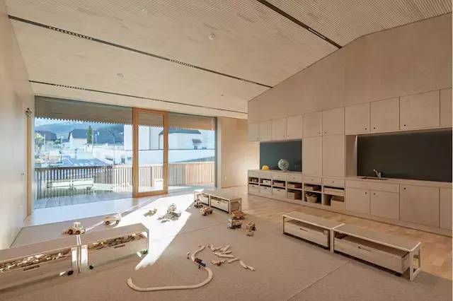 在小鎮(zhèn)的教堂附近,有一座新建的占地950㎡的幼兒園,幼兒園有一個(gè)大大的露天庭院,院里種植這草皮,還設(shè)計(jì)有一小塊沙地,孩子們可以在這小沙池中玩耍,靠近庭院的一面墻體的設(shè)計(jì)也是非常有意思,里面是安裝了木梯的攀巖墻,還有一部滑梯,所以即便是雨天,孩子們也可以在這個(gè)小天地里愉快的玩耍。幼兒園的設(shè)計(jì)也遵循著小鎮(zhèn)的風(fēng)格漆白的墻面外部用木材裝飾和周圍的小鎮(zhèn)建筑以及自然景物,和諧相融。