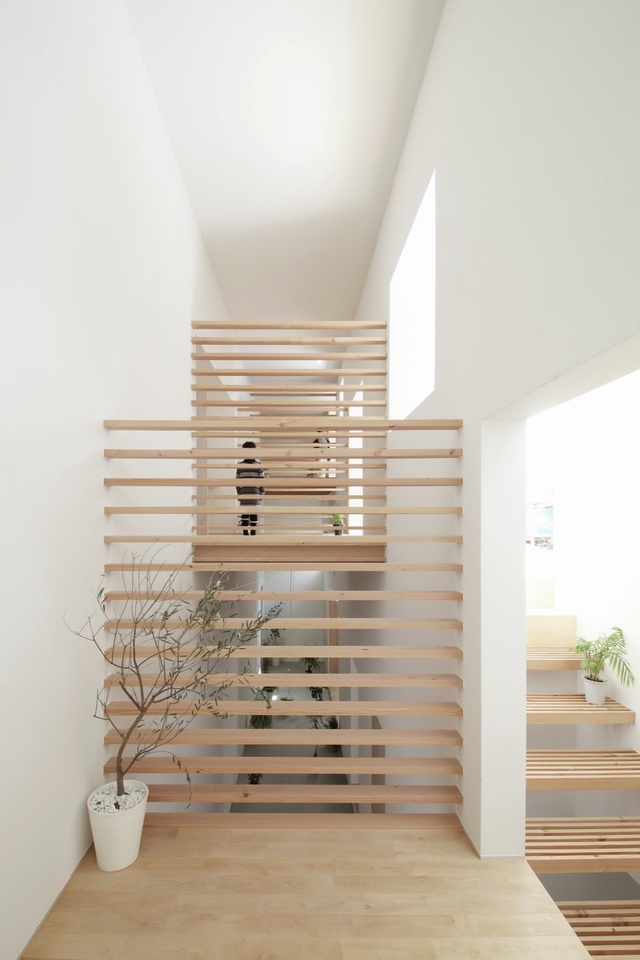 于是設(shè)計(jì)師就有了一個(gè)反L的建筑方案,而陽光收集器就是搞起來的那一部分,通過建筑頂部的天窗和方窗把陽光大口的吞噬到了室內(nèi),在室內(nèi)的陽光收集器也作為樓梯,在第二層部分設(shè)計(jì)了幾間臥室,為了能讓陽光更加有效的投到首層,樓梯采取了格柵的形制,這樣使得陽光的光想盡可能的漏下去。