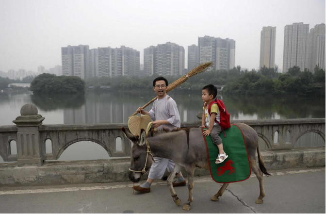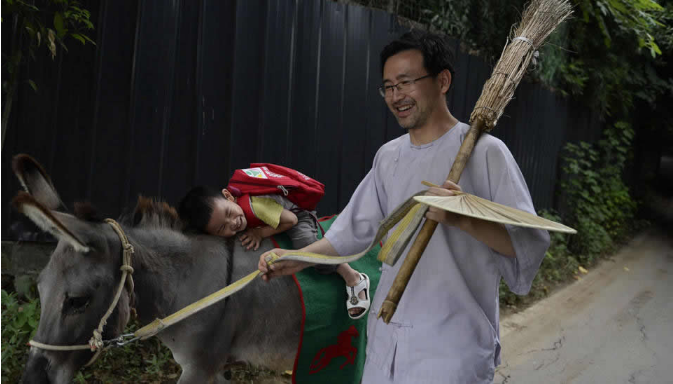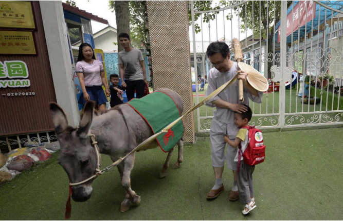 李里牽驢到幼兒園門(mén)口接孩子,路上教孩子背《三字經(jīng)》、《劍門(mén)道中遇微雨》