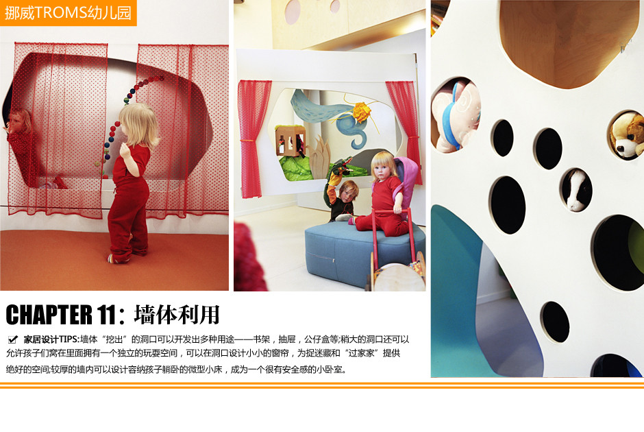 11、墻是這所幼兒園空間的核心設(shè)計(jì)元素。一般意義上,墻體只承擔(dān)分隔空間和隔音的作用,但這里被賦予了更豐富的功能。或者說,家具與墻的界限變得非常模糊。簡單的折疊和推拉墻面即可改變房間的大小,創(chuàng)造出容納新功能的空間。墻面采用不同的材質(zhì),擁有鮮艷的色彩,并且開設(shè)了許多形狀大小各不相同的洞口。