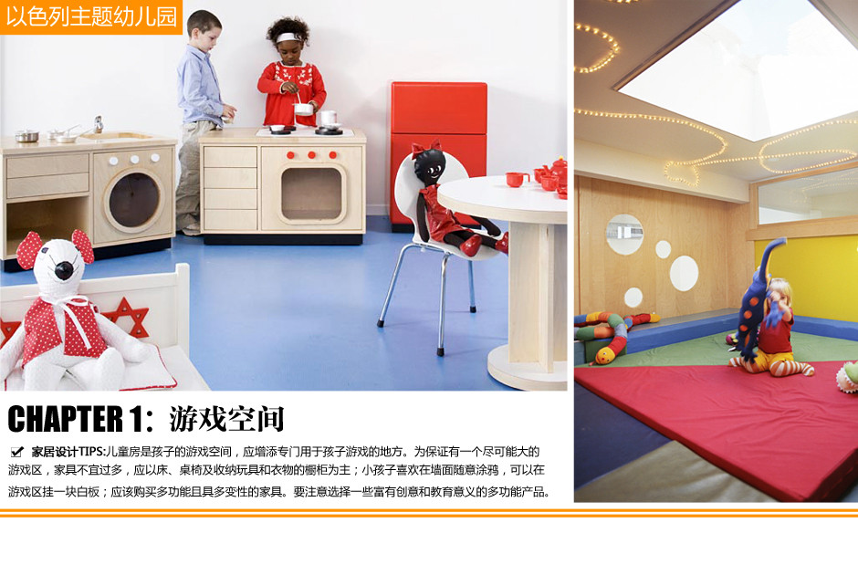 1、幼兒園的活動(dòng)室可愛而多變化,具備光線充足、空氣流通、色調(diào)柔和三大條件。空間以藍(lán)色、白色、紅色及天然木質(zhì)原色為主,玩具設(shè)施以啟發(fā)性大、危險(xiǎn)性小為宜。這個(gè)活動(dòng)室以模擬家具為特色,玩具冰箱、玩具烤爐,甚至是玩具醫(yī)護(hù)床,都是純手工的木雕作品,它們經(jīng)過涂漆、貼膜的處理,呈現(xiàn)出家的感覺。